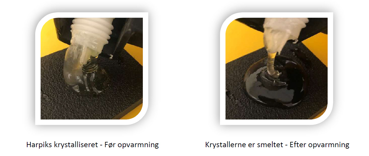 For at opnå epoxyharpiksens smeltetemperatur opvarmes epoxyen til 40-50°C i ca. 60-120 minutter (kan variere afhængig af emballagestørrelse), hvorefter epoxyen skal afkøle langsomt til normal rumtemperatur.